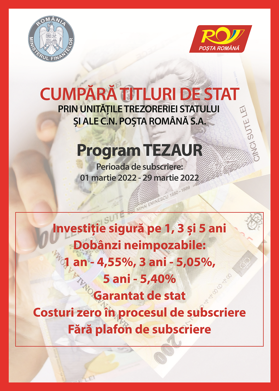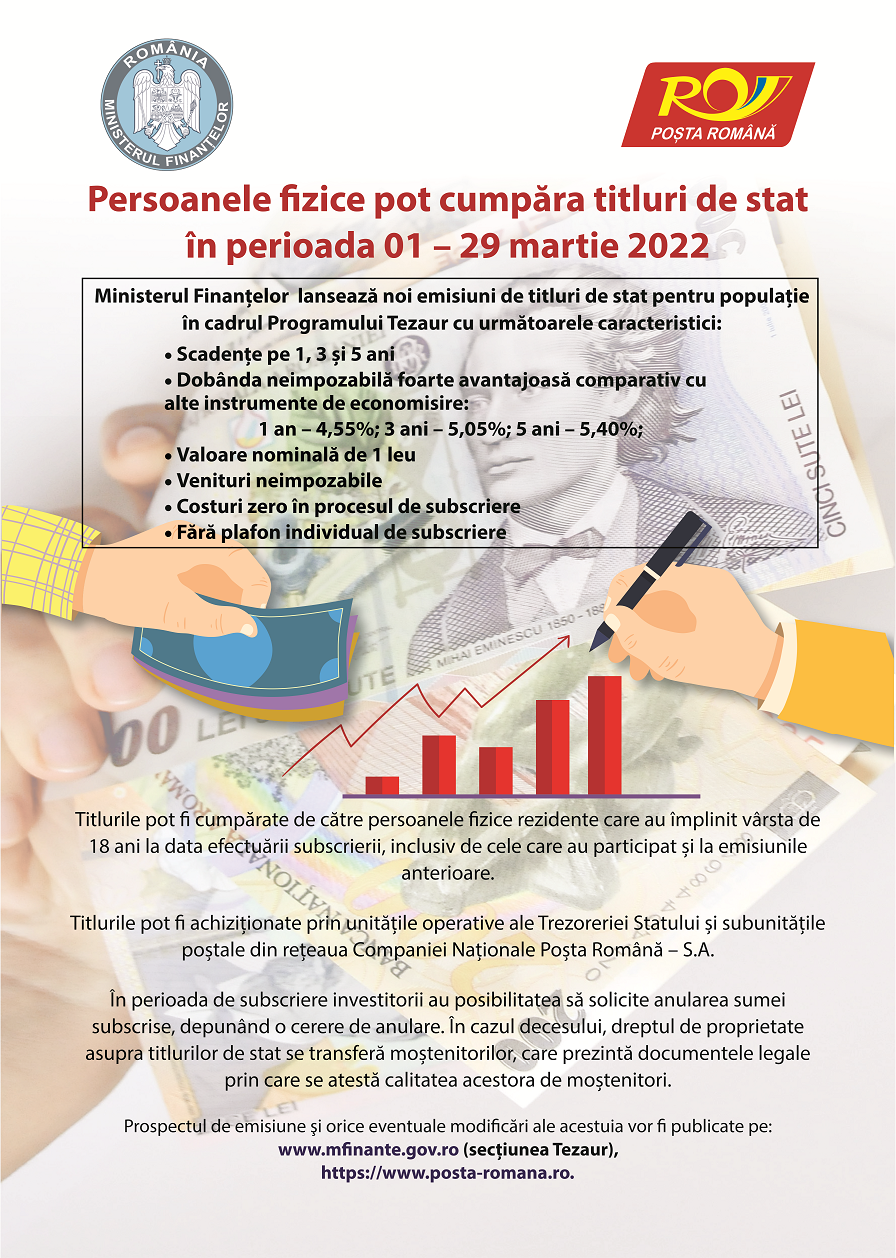 Ministerul Finanțelor lansează noi emisiuni de titluri de stat pentru populație în cadrul Programului Tezaur cu următoarele caracteristici: